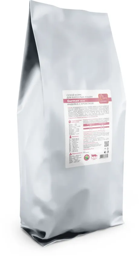 Дегидрированное мясо индейки, креветки, ферментированная пшеница, бурый рис (источник пищевых волокон), маис, птичий жир, сушеная мякоть сахарной свеклы (способствует улучшению работы ЖКТ), пивные дрожжи (натуральный источник пребиотиков MOS), натуральные вкусоароматические добавки, рыбий жир, витаминно- минеральный комплекс: A, D3, E, К3, B1, B2, B3, B4, B5, B6, H; микроэлементы : железо, медь, цинк, марганец, йод, селен; клюква, таурин, экстракт Юкка Шидигера, натуральный антиоксидант.