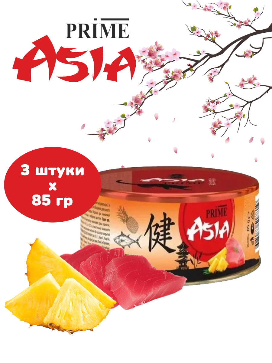 Корм для кошек влажный PRIME ASIA Тунец с ананасом в желе - 3 железных банок с ключом по 85г
