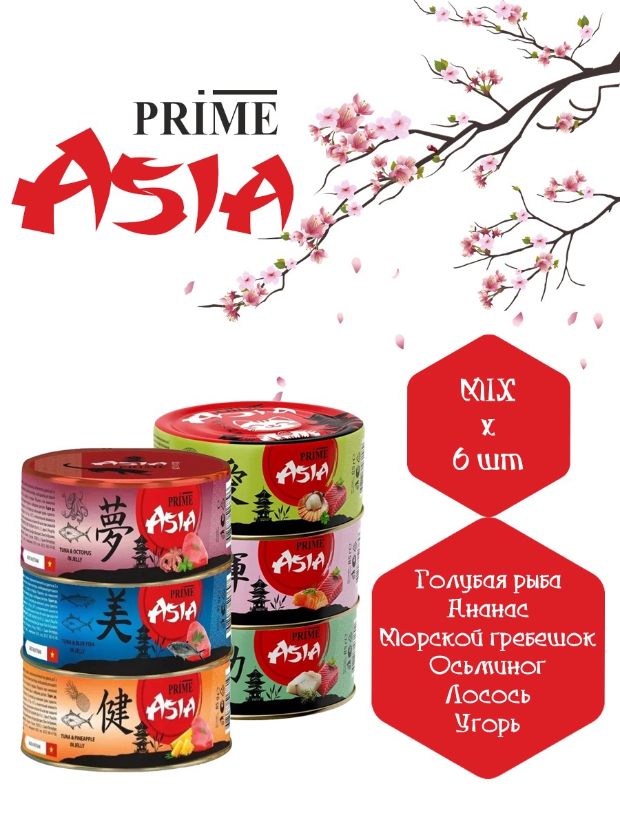 Корм для кошек влажный PRIME ASIA Тунец кусочки в желе МИКС 6 вкусов - 6 железных банок с ключом по 85г