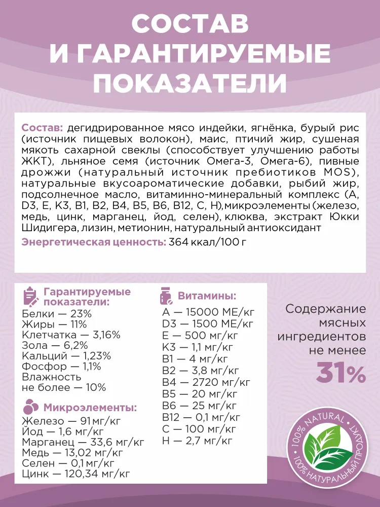 Дегидрированное мясо индейки, ягнёнка, бурый рис (источник пищевых волокон), птичий жир, сушеная мякоть сахарной свеклы (способствует улучшению работы ЖКТ), льняное семя (источник Омега-3, Омега-6), пивные дрожжи (натуральный источник пребиотиков MOS), натуральные вкусоароматические добавки, рыбий жир, подсолнечное масло, витаминно-минеральный комплекс : A, D3, E, К3, B1, B2, B4, B5, B6, B12, C,H, микроэлементы : железо, медь, цинк, марганец, йод, селен, клюква, экстракт Юкка Шидигера, лизин, метионин, натуральный антиоксидант.