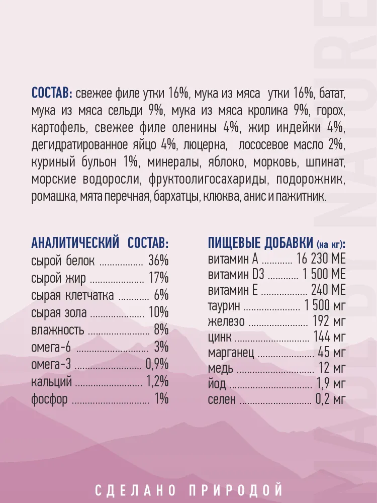 Свежее филе утки (16%), мука из мяса утки (16%), батат, мука из мяса сельди (9%), мука из мяса кролик (9%), горох, картофель, свежее филе оленины (4%), жир индейки (4%), дегидратированное яйцо (4%), люцерна, лососевое масло (2%), куриный бульон (1%), минералы, яблоко, морковь, шпинат, морские водоросли, фруктоолигосахариды, подорожник, ромашка, мята перечная, бархатцы, клюква, анис и пажитник.
